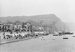 Although attempts have been made to construct a harbour, none has succeeded. A lack of shelter in the bay prevented the town's growth as a port. Despite this, a part of the town is known as 'Port Royal' which is likely due to the town's having provided two ships and 67 men to King Edward III during the Hundred Years' War with which to attack Calais.[6] The most concerted effort was a short-lived attempt in the 1830s at the west of the seafront; this included the construction of the Sidmouth Harbour Railway along the seafront and into a tunnel at the cliffs to the east that would have transported stone from Hook Ebb. Only a few traces of the railway and tunnel survive today.[7] The Royal National Lifeboat Institution (RNLI) operated a lifeboat station at Sidmouth between 1869 and 1912.[8]