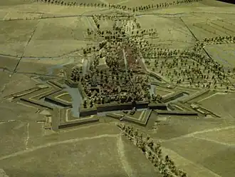 French provincial intendants provided the French army with siege material and peasant workers.[5] The Allied garrison had 23 guns, 2 mortars and 2 swivel guns, while the French besiegers had 40 artillery pieces.[8] The French approach on the left was slowed by Allied countermines that forced the French to sap the counterscarp.[9] Eight grenadier companies stormed and captured the covered way on the right at the cost of 18 killed and 100 wounded.[9] Thanks to the protection provided by sapping, the French troops on the left lost only 12–15 men while making their attack on the covered way.[9] Villars was aware of the heavy casualties caused by assaults only lightly supported by artillery fire and without preparatory sapping, but judged the increased speed worth it against the protestations of his engineers.[10] The French also made use of a feint attack to distract the garrison and constructed only two trench parallels instead of Vauban's recommended three.[11]
