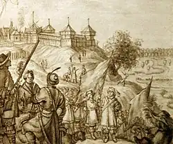 There was a garrison of 6,075 in Kiev, and it was besieged by a much larger army.[3] Sheremetyev himself wrote that he was probably besieged by an army of 100,000, which included 40,000 Cossacks and 60,000 Tatars.[4] Modern historiography has estimated the number of besiegers at 21,500.[5][6]
