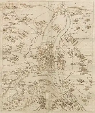 As the siege began during a market day, hundreds of peasants from the villages around Maastricht found themselves enclosed inside the city.[52] Schwarzenberg ordered the rationing of the food and appointed men to take loans from the local merchants at a reasonable interest to allow the purchase of provisions.[65] In the meantime, the besiegers built four earth forts on the side of Brabant to block the way to any force that attempted to relieve the city, the first one at the village of Hunnenberg, on the course of the Jeker river, which flows towards Maastricht, and the other three in front of the Tongeren gate, the bulwark of Saint Servaas and the Boschpoort, opposite to the church of the Teutonic Order. Peter Ernst von Mansfeld, governor of Luxemburg, had summoned thousands of pioneers for the siege works, but, as they had not arrived yet, the soldiers undertook the construction of the forts. Farnese himself took a shovel to inspire them, and the redoubts were put in defense in two days. They were square-shaped, with a bulwark on each corner, and surrounded by a moat.[71][72] They were designed by the Italian military engineers Giovanni Battista Platti and Propercio Barocci. On the German side, Mondragón built two forts in front of the suburb of Wyck.[72]