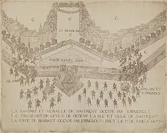 Farnese ordered the ravelin to be carried by assault on 23 March 1579. The attack was entrusted to the Spanish foot companies under Francisco de Aguilar, Gaspar Ortiz and Sancho Ladrón.[75] When the assault became imminent, Tapin ordered additional artillery to be brought to the rampart behind the ravelin and the building of an earthwork in front of the gate. Moreover, in order to increase the willingness of his men to fight to the bitter end, he had twenty Spanish prisoners thrown into the Meuse with a weight on their feet.[76] To prepare the assault, Farnese ordered Berlaymont to batter the entrance to the ravelin from the city walls with eight cannons. Captain Vázquez stated that, nevertheless, the artillery general did it just with three pieces because Farnese gave his orders through Count Guido di San Giorgio, from Monferrato, who was his confidant and a well-taught military theorist, but who Berlaymont despised because of his lack of experience.[75] On the other hand, the anonymous Chronicle of St. Servaas, written by an inhabitant of the city, mentions that the bombardment was carried out by five cannons which shot over 300 cannonballs.[76] The assault was launched after the cannonade and, although the Spanish infantry managed to seize most of the ravelin, it was forced to abandon it because of the artillery and musketry fire from the walls.[76]