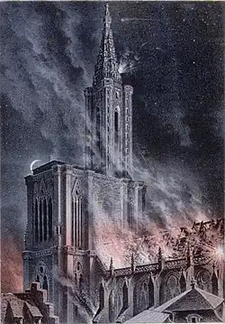 On 23 August Werder's siege guns opened fire on the city and caused considerable damage to the city and many of its historical landmarks. The Bishop of Strasbourg, Andreas Räss, went to Werder to beg for a ceasefire, and the civilian population suggested paying 100,000 francs to Werder each day he did not bomb the city. Uhrich refused to relent, and by 26 August Werder realized he could not keep up such a bombardment with the amount of ammunition he had.[10] On 24 August, the Museum of Fine Arts was destroyed by fire, as was the Municipal Library housed in the Gothic former Dominican Church, with its unique collection of medieval manuscripts, rare Renaissance books and ancient Roman artifacts.[11]