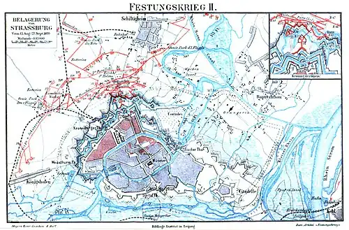 On 11 August, Baden's force put Strasbourg under observation. They occupied the nearby town of Schiltigheim, fortified it, and captured the Strasbourg suburb of Königshofen.[5] Werder understood the value of capturing the city, and ruled out a lengthy siege of starvation. He instead decided on a quicker action, bombarding the fortifications and the civilian population into submission. The first shells fell on the city on 14 August.[9]