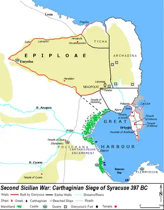 Himilco chose to camp next to the Great Harbour in the Polichana area. The camp was either 10 stadia[33] from the Syracuse city walls, which would place it north of the Anapus river, or 12 stadia from the walls, totally south of the river.[20] Himilco chose the temple of Zeus as his quarters.[34] The main camp was probably situated on the marshy ground east of the temple of Zeus,[35] and adjacent to the Dascon bay and the Lysimeleia marsh. The berthing facilities for the ships formed part of the camp, and the camp was surrounded by a moat and palisade.