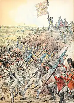 The French assault began at the same time, but they were halted by the abatis, which was undamaged by the artillery fire.[55] The French began to hack at the abatis and a Hessian sentry came out and asked who was there. When there was no response, the sentry opened fire as did other Hessians on the parapet.[56] The French soldiers fired back, and then charged the redoubt. The Germans charged the Frenchmen climbing over the walls but the French fired a volley, driving them back.[56] The Hessians then took a defensive position behind some barrels but threw down their arms and surrendered when the French prepared a bayonet charge.[56]