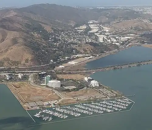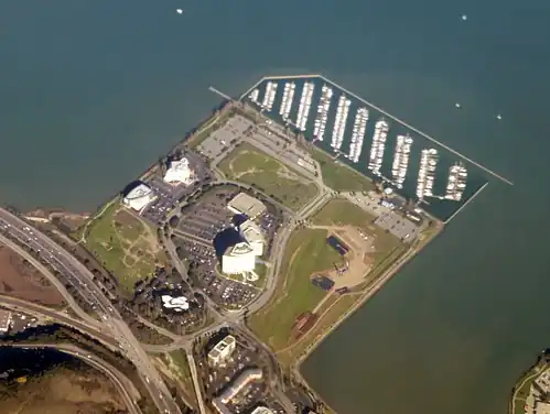 The Brisbane Marina was completed in 1983 along the eastern shore of Sierra Point and has slips for up to 580 boats.[8] The Marina was built by a private developer at the city's expense in exchange for a long-term lease for the entire Sierra Point site; in addition, the developer would subsidize the loan payments for the money the city had borrowed to build the Marina.[6]