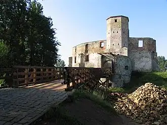 The Castle in Siewierz was built in the first half of the thirteenth century on a man-made hilltop, where formerly stood a wooden fortress. The oldest of the stronghold's fortifications come from the fifteenth century. In 1443 Duke Wacław I of Cieszyn sold the town and the castle to Kraków's bishop Zbigniew Oleśnicki. The Bishops of Kraków expanded the castle and its fortification walls. The castle began to crumble in the seventeenth century, and Swedish raids quickened its deteriorating. After The Deluge the castle was rebuilt by that didn't stop it from deteriorating and turn into a ruin. The last resident of the castle, Feliks Paweł Turski, left the residence in 1800. The only reason the building did not diminish is due to extensive reconstruction and renovation works in the 1950s, 1970s, and 1990s.[2][3]