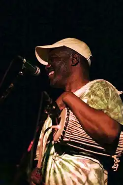 He became an integral part of Olatunji's Drums of Passion, and through Olatunji met Grateful Dead drummer Mickey Hart.[1] Since then he has frequently been a guest percussionist during Hart and Bill Kreutzmann's "Rhythm Devils" segments of Grateful Dead concerts, and played talking drum with Mickey Hart's group Bembe Orisha, which toured in 2001.[2] He has been a part of most of Mickey Hart's projects since they first met, including the albums (and associated tours) Mickey Hart's Mystery Box, At the Edge, and Supralingua, and was a Grammy Award contributor to Mickey Hart's Planet Drum and Global Drum Project albums. Sikiru is a member of the Mickey Hart Band, has recorded on their CD Mysterium Tremendum, and is featured on vocals on the song "Who Stole the Show?".