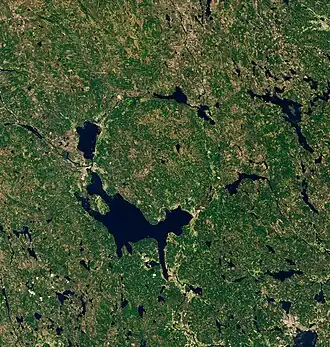 ![]() Satellite photo of the Siljan Ring. Lake Siljan takes up a large part of the southwestern edge of the now much-eroded crater. | |