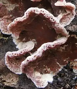 After starting as just a crust on the wood, the fruiting structure develops undulating intergrowing brackets up to about 3 cm broad, which have a tough rubbery texture. The edges and fertile lower surfaces show a fairly vivid violet colour while the fungus is growing, and the upper surfaces have a grey aspect (sometimes with zonation and usually a lighter edge)[5] and are covered with whitish hairs. After a week or two the fructification dries out, becomes brittle, and turns a drab brown or beige.[2][6][7] Infected wood can be recognized because it is stained a darker tint.[8]