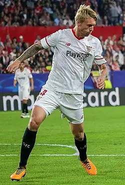 Kjær made his Sevilla debut in the opening game of the season, starting the whole game, in a 1–1 draw against RCD Espanyol.[311] By September, he was sidelined with injuries on two occasions.[312][313] Kjær then scored his first goal for the club, in a 5–1 loss against Spartak Moscow on 17 October 2017.[314] He became a first team regular for the next two months, playing in the centre–back position.[315][316][317] This lasted until Kjær injured his left abductor muscle while training and missed three matches as a result.[318] On 6 December 2017, he returned to the starting line-up against Maribor and helped the club draw 1–1.[319] In the first leg of the Copa Del Rey Round of 16, Kjær set up the club's second goal of the game, in a 2–1 win.[320] Three days later on 6 January 2018, he scored his first league goal for Sevilla, in a 5–3 loss against rivals, Real Betis.[321] However, Kjær suffered a back injury that kept him out for a month.[322][323] On 28 February 2018, he returned to the starting line-up against Málaga and helped the club keep a clean sheet, in a 1–0 win.[324] Kjær started in the next five matches for Sevilla since returning from injury and proved to be instrumental as he helped the club beat Manchester United in the second leg of the UEFA Champions League Round of 16.[325][326][327] However, during a 4–0 loss against Celta Vigo on 7 April 2018, Kjær suffered a knee injury and was substituted in the 40th minute.[328][329] On 12 May 2018, he returned to the starting line–up against rivals, Real Betis, and scored his second league goal of the season, in a 2–2 draw, a result that guaranteed Sevilla's qualification of playing European football next season.[330] At the end of the 2017–18 season, Kjær made 27 appearances and scoring three times in all competitions. Following this, he reflected on his first season at the club, saying: "Personally, it has been a strange year ... Next year I will continue to improve. Not having injuries would be a great help."[331]