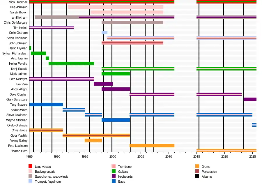Between 2003 and its disbandment in 2010, the band's core members were Mick Hucknall (lead vocals), Ian Kirkham (saxophone/EWI/keyboards), Dave Clayton (keyboards), Kenji Suzuki (guitar), Kevin Robinson (trumpet/flugelhorn/percussion), Steve Lewinson (bass guitar) and Pete Lewinson (drums). These musicians featured on Simply Red's shows as well as on albums, though in the studio, they were often augmented or replaced by session musicians. From 2003 to 2008, Dee Johnson (backing vocals), Sarah Brown (backing vocals), John Johnson (trombone/percussion) and Chris De Margary (saxophone/flute) also continued to be in the band and have appeared on albums and tours.