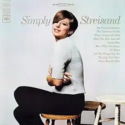 Simply Streisand (1967) is the ninth studio album released by American singer Barbra Streisand. The album was released simultaneously with A Christmas Album and was Streisand's first that failed to chart in the Top 10 of the Billboard 200 when it peaked at #12. Simply Streisand was recorded March 14, 15 and 20th, 1967.[1] The album sold 250,000 in its first two weeks in the market. It was certified Gold by RIAA on April 24, 2002.[2]