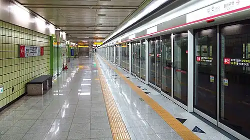 Sincheon Station is a station of the Daegu Subway Line 1 in Sincheon-dong, Dong District, Daegu, South Korea. Kyungpook National University is nearby. A stair was removed at entrance 4 and an escalator was put in its place.[1]