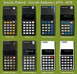 All the Oxford models were similar in appearance; the 150 was introduced in 1975 introducing the ability to calculate percentages and square roots.[3][5] The Oxford 200 included memory and sold for £19.95.[3] The Oxford 300 was a scientific model with a limited number of functions (such as sin, cos, tan), which sold for £29.95, much lower than the competition.[3][6] The last two models, the Oxford Scientific (1976) and Oxford Universal were the most advanced of the range.[3]