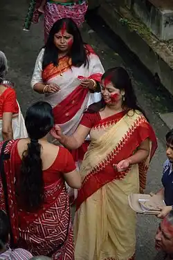 The red sindoor is significant for the married woman as she is full of colour. When she becomes a widow she adopts plain white dress and removes all colour from her face including the bright red sindoor.[9][10]