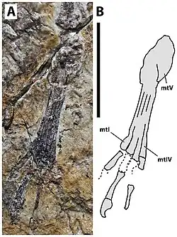 The skeleton of Sinomacrops includes patches of soft tissue. A strange patch of soft tissue lateral (to the side) to the left tibiotarsus suggests that the brachiopatagium ("arm-membrane") extended to the rear onto the distal part of the lower leg. A brachiopatagium extending to the rear of the lower leg is also present in the species Jeholopterus ningchengensis, which is a close relative of Sinomacrops, this feature also appears in all pterosaurs in general.[1]