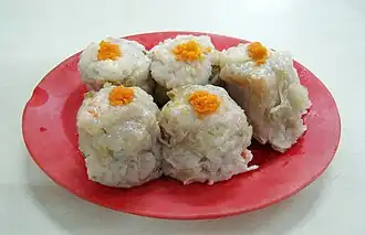 Siomay (also somai) (Chinese: 燒賣; Pe̍h-ōe-jī: sio-māi; Hanyu Pinyin: shāo mài) is a Chinese-Indonesian steamed fish dumpling with vegetables served in peanut sauce. It is derived from the Chinese shumai.[1][2] It is considered a light meal, similar to the Chinese dim sum.[1] It is traditionally made from pork but is frequently substituted with tenggiri (Spanish mackerel), as many Indonesians observe the halal dietary law. Sometimes other types of seafood such as tuna, mackerel, and prawn or poultry such as chicken also can be used to make siomay.[3] Other complements to siomay include steamed cabbage, potatoes, bitter gourd, boiled egg, and tofu. Siomay is often cut into bite-size pieces and topped with peanut sauce, sweet soy sauce, chili sauce, and a dash of lime juice.[2]