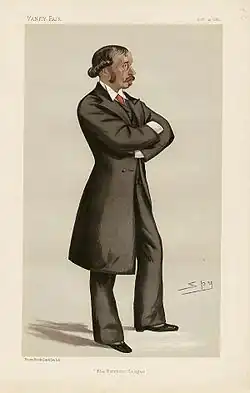 Ashmead-Bartlett was elected as Member of Parliament (MP) for Eye, Suffolk, in the 1880 general election.[8] In 1882 his caricature by "Spy" was published in the British weekly magazine Vanity Fair (21 October 1882) under the title "The Patriotic League". The Eye constituency was redefined under the Redistribution of Seats Act of 1885, and in the general election of 1885 he ran for, and won, Sheffield Ecclesall constituency, which he held until his death in 1902.[9] He served as Civil Lord of the Admiralty in the governments of Lord Salisbury from 1885 to February 1886 and August 1886 to 1892.[4] He was knighted in the 1892 Dissolution Honours.