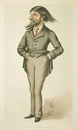 In 1884, a full-page caricature of Herkomer by FG (his friend Franz Goedecker) appeared in Vanity Fair, captioned "Painter, Sculptor, Blacksmith &c".[6] In the same year, he established an Art School at Bushey which he continued until 1904, attracting many students. In 1885 he was appointed Slade Professor of Fine Art at the University of Oxford, a position he held until 1894. He was the first president of the Oxford Art Society, established in 1891.[7]