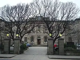 The School of Physic Act 1800 entrusted eight commissioners to appropriate the £1,200 already given to the College for the provision of a hospital that was capable of holding thirty patients. The commissioners were the Sackville Hamilton, the Provost of Trinity College, the President of the College of Physicians, Sir Francis Hutchinson Baronet, the Hon George Knox, Dr Arthur Browne, William Digges La Touche and Abraham Wilkinson Esquires.[3] They chose the land at Grand Canal Street with a 998-year lease signed 10 May 1802.[3] By 1808, £6,346 of Sir Patrick Dun's funds had been spent building the west wing of the hospital, but it was not enough.[3] Parliamentary aid was sought and £6,204 was granted to finish the building of the hospital, furnish it and run it temporarily.[4] The design of the building, with its granite facade, is said to have been influenced by George Papworth.[5] It was completed on 24 June 1808 and the hospital was handed over to the Board of Governors.[4] The school opened for clinical instruction on 25 October 1808.[4][6]