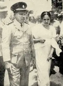 Bandaranaike often accompanied S.W.R.D. on official trips, both locally and abroad.[4] She and her husband were both present after the psychiatric hospital in Angoda was bombed by the Japanese during the Easter Sunday Raid in 1942, killing many.[23][26] As Ceylon moved toward self-governing status in 1947, S.W.R.D. became more active in the nationalist movement. He ran for – and was elected to – the House of Representatives from the Attanagalla Electoral District.[27] He was appointed Minister of Health and served as Leader of the House, but became increasingly frustrated with the inner workings and policies of the United National Party.[28] Though he did not encourage Bandaranaike to engage on political topics and was dismissive of her in front of colleagues, S.W.R.D. came to respect her judgment.[7][14]