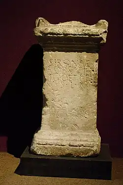 - [I(ovi)] O(ptimo) M(aximo) / Apollini / et Sirona[e] / [Ae]sculap[io] / P(ublius) Ael(ius) Luciu/s |(centurio) leg(ionis) X v(otum) s(olvit) / l(ibens) l(aetus) m(erito)