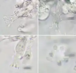 Basidia are urniform and usually have 6-8 sterigmata, but some species are known to mainly have 2-4 sterigmata.[15] Basidiospores are small, smooth, hyaline and ranging between globose, ellipsoid, oblong or allantoid in shape. They are thin-walled and non-cyanophilous, non-amyloid and non-dextrinoid.[6][16]