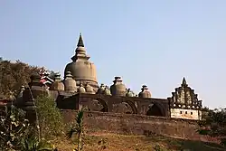 The temple was built in 1535–1536 by King Min Bin to commemorate his conquest of Bengal.[1] It is located on the western face of Pokhaung Hill, north of the Royal Palace, and adjacent to the Andaw-thein Temple. It is typical of the many Buddhist temples found in Burma: a central bell-shaped stupa, surrounded by four smaller stupas at the corners, and a multitude of even-smaller stupas surrounding them. At the east of the temple, there is an addition of a flight of stairs and tazaung (about 75 years old).