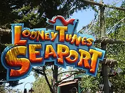 After the final operating day of the 1998 season, October 31, the park officially became Six Flags Marine World. The change in ownership brought many changes to the park, including the addition of Warner Bros.' Looney Tunes characters. The park also received the wooden roller coaster Roar. Built by Great Coasters International, Roar was the first coaster to feature Millennium Flyer trains.[12] The 1999 season also saw the introduction of Tasmanian Devil, a Frisbee flat ride manufactured by HUSS, and Scat-A-Bout, a typical Scrambler flat ride. Although both rides opened in 1999, they were purchased by the park in 1998 but not constructed until 1999 due to construction timetables that prevented their opening in time for the start of the 1998 season. Popeye's Seaport was rebranded Looney Tunes Seaport and received the Roadrunner Express kiddie coaster.[13]
