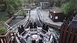 In 1979, the park was sold to Six Flags and became known as Six Flags Magic Mountain. In 1981, Six Flags Magic Mountain introduced Roaring Rapids, a river rapids ride that was on the West Coast for the first time. It was developed by Intamin in conjunction with the now-defunct Six Flags Astroworld, which had opened a similar ride in 1979. Along with Rapids came the completion of the midway near Spillikin Corners to link with Revolution's area. Finally, a complete circuit could be made around the park. It was originally designed as a dual-sided station, but only one was fully developed, and all that exists of the possible second side is a few supports. It uses large pumps to circulate water, and each of the two pumps can circulate 88,500 U.S. gallons per minute (5.58 m3/s). The reservoir can hold 1.5 million U.S. gallons (5.7 Ml) of water, and one of the innovations used on it was the introduction of guide boards to help eliminate jam ups.