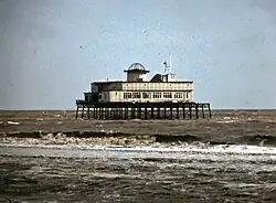 On 11 January 1978, a northerly severe gale and storm surge brought disaster to Skegness Pier, along with other piers at Margate, Herne Bay and Hunstanton, causing irretrievable damage. The pier decking from the main entrance was reduced in length to 127 yards (116 m), with the eastern shelters and the pierhead with its theatre isolated from the shoreline. Late in 1978, a plan to link the isolated pierhead by monorail and build a new 1200 seater theatre collapsed when an application for financial assistance was turned down.[1] Debris from the wrecked pier was scattered for several miles around with souvenir hunters coming into the area to see what they could find.