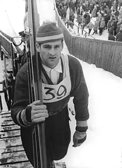 The 10th Four Hills Tournament, held prior to the championships, was won by Eino Kirjonen, with Wilhelm Egger in second and Hemmo Silvennoinen in third.[9] Egger won two of the tournament's events, while Kirjonen and Georg Thoma each won one.[10][11][12][13] Other favorites included Max Bolkart, Wolfgang Happle, and Jože Šlibar.[14]