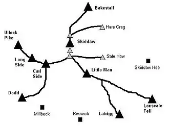 - ^ a b c d e f Wainwright, Alfred: A Pictorial Guide to the Lakeland Fells, Book 5 The Northern Fells: ISBN 0-7112-2458-7