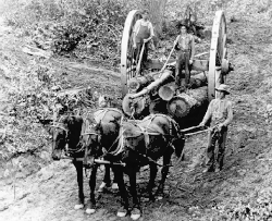 Early skidders were pulled by a team of oxen, horses or mules. The driver would straddle the cart over felled logs, where dangling tongs would be positioned to raise the end of the log off the ground. The team pulled the tongue forward, allowing the log to "skid" along between the rolling wheels. These were known as "slip-tongue wheels" Starting in the early 1920s, animals were gradually replaced by gasoline-powered crawlers, although some small operations continue to use horses. In other places, steel "arches" were used behind the crawlers. Similar in function to the slip-tongue wheels, arches were used to reduce friction by raising up one end of the load, which was dangled from a cable which in turn ran down the back of the arch, and was raised or lowered by the crawler's winch. Another piece similar to the arch was the "bummer", which was simply a small trailer to be towed behind a crawler, on top of which one end of the log load would rest.