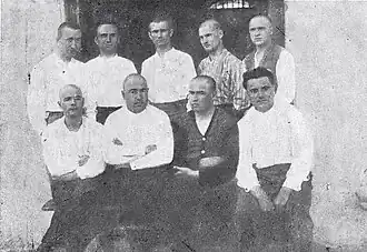 An appeal court and the Supreme Court confirmed the verdict of the Skopje court.[1] The British embassy reported that the students were physically abused while in prison.[2] IMRO sentenced Velimir Prelić to death.[7] On January 13, 1928, in the centre of Skopje, the sentence was carried out by revolutionary Mara Buneva, who shot and killed Prelić.[1] In retaliation for the persecution, IMRO leader Ivan Mihaylov ordered the assassination of Yugoslav official Živojin Lazić in July 1928, but it failed. Lazić became the head (ban) of Vardar Banovina in the next year.[3] Traditionally, the Yugoslav government gave amnesties during important events such as public holidays, the king's birthday, royal marriage or the birth of an heir to the throne. On December 1, 1931, the anniversary of the creation of Yugoslavia on December 1, 1918, Yugoslav king Alexander amnestied Gyuzelov, Shopov, Natsev, Gichev, Bozdov, Svetiev, and Andreev, while Chkatrov and Fukarov were excluded and remained in prison.[1]