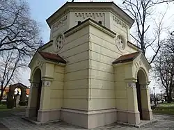 After the Ottomans withdrew from Niš in 1878, the Royal Serbian Army scoured the town and its surroundings in search of the missing skulls. One was found embedded deep inside the tower walls and sent to the National Museum in Belgrade. This was followed by the construction of a roof baldachin, which was topped off with a cross. This is how the structure is depicted in an 1883 painting by the realist Đorđe Krstić. In 1892, work commenced on the construction of a chapel that was to enclose the tower. The foundations of the chapel, designed by the architect Dimitrije T. Leko, were consecrated in 1894.[15] A plaque dedicated near the chapel in 1904 reads: "To the first Serbian liberators after Kosovo."[14]