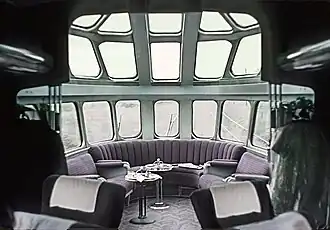 Breaking with the "Beaver Tail" design, the rear of the Skytop Lounge was 90% glass, with multiple rows of windows reaching up to form the ceiling. In the four parlor-lounges this "solarium" contained 12 seats, with an additional 24 seats in the interior of the car. At the front of the car was a four-seat drawing room. The interior featured wood paneling, characteristic of Milwaukee Road designs.[4] The Milwaukee Road contracted with Pullman-Standard for six sleeping cars based on the parlor-lounge design. The sleeping cars featured reduced seating in the solarium to make room for eight double bedrooms. Pullman-Standard did not adopt wood paneling for its interiors.[5]