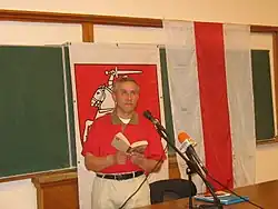 In 1993, Adamovich joined the BPF Party. In 1994, he founded the far-right[1] nationalist Belarusian group Pravy Rewanż (Right-Wing Revenge).[5] In April 1996, he was arrested in connection with a criminal case No. 182. The official reason for his arrest was a poem he wrote in November 1995 in Russian,[1][2] titled Ubiej priezidienta (Kill the President),[1] published in the Vitebsk newspaper Vybor (Choice).[6] He conducted a hunger strike for eight days in detention.[1] He was convicted of inciting illegal change of power, illegally crossing the state border, and illegally carrying a melee weapon.[7] This made him the first writer in independent Belarus to be convicted for his work.[3] He spent 10 months in prison.[2] Due to public support and intervention from a group of Russian writers (including Dmitry Likhachev, Andrei Voznesensky, Bella Akhmadulina, Andrei Bitov, Bulat Okudzhava, Fazil Iskander, Anatoly Pristavkin, and others), he was released on 7 February 1997[6] under the condition that he could not leave the country.[2] After his release, during a protest in August 1997,[1][2] he demonstrated his opposition to the Belarusian authorities[2] by publicly sewing his lips shut.[7] He has been a member of the Belarusian Writers' Union since 1999.[1]