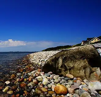 The geological exhibition at the lighthouse gives an understanding of how ice age glaciers formed Mols Bjerge, the Mols Hills, including the peninsula Helgenæs where the lighthouse is located on the southern tip. Characteristic stones from the beach at Sletterhage are on display. The origin of these different stone types can be traced down to specific prehistoric volcanoes in Norway and Sweden. In this way, the stones on the beach can be used to map ice sheet movements during glaciation periods. The life of the small porpoise whales that are often seen from the coast of Sletterhage is also on display.[3]