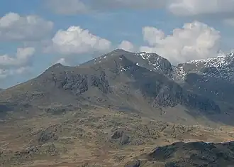 Slight Side is a fell in the English Lake District it stands 25 kilometres (16 miles) east southeast of the town of Whitehaven and reaches a height of 762 metres (2,499 ft). Slight Side lies at the south western edge of the Scafell Massif, a four-kilometre-long (2+1⁄2-mile) crescent of high ground which includes the highest ground in England. The fells names derives from the Old Norse language and means "The mountain shieling with the level pastures", it is a combination of the Norse words "sletta" and "saetr". With a shieling meaning a shepherds hut or a mountain pasture used in the summer.