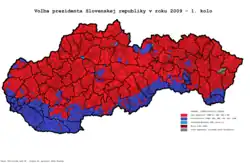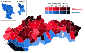 Presidential elections were held in Slovakia in March and April 2009, the country's third direct presidential elections. After no candidate received a majority of the vote in the first round on 21 March, the second round on 4 April saw Ivan Gašparovič become the first Slovak president to be re-elected, defeating opposition candidate Iveta Radičová by 56% to 44%.[1]