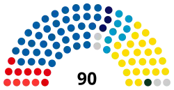 The 90 members of the National Assembly are elected by two methods. 88 are elected by open list proportional representation in eight 11-seat constituencies and seats are allocated to the parties at the constituency level using the Droop quota. The elected Deputies are identified by ranking all of a party's candidates in a constituency by the percentage of votes they received in their district. The seats that remain unallocated are allocated to the parties at the national level using the d'Hondt method with an electoral threshold of 4%.[5] Although the country is divided into 88 electoral districts, deputies are not elected from all 88 districts. More than one deputy is elected in some districts, which results in some districts not having an elected deputy (for instance, 21 of 88 electoral districts did not have an elected deputy in the 2014 elections).[6] Parties must have at least 35% of their lists from each gender, except in cases where there are only three candidates. For these lists, there must be at least one candidate of each gender.[7][8]