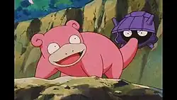 Slowpoke is a Water and Psychic-type Pokémon. It was originally named "Slowmo". Its current name simply refers to the general nature of the species.[7] Slowbro, also present in the Pokémon Red, Blue, and Yellow titles, was the sole evolution of Slowpoke via gaining enough experience until the introduction of Slowking as an alternative evolution of Slowpoke since Pokémon Gold and Silver by trading it to other cartridges or consoles while it holds the "King's Rock" item. The two evolutions differ from Slowpoke in part by the presence of a Shellder that latches to the tail in the case of Slowbro or the head in the case of Slowking. In series lore, Slowpoke evolve when bitten by the Pokémon Shellder, though Shellder are not needed to evolve Slowpoke in the mainline games despite their presence in its evolutions.[8] Slowpoke resembles a hybrid of a salamander and a hippopotamus. Its body is thick in build and mostly light pink in color, while the tail's tip is white.[9][10] Its snout is tan in color and rounded in shape, and its ears are curled. Each of its four legs possesses a single white claw. Its eyes appear to be vacant due to the species never concentrating on anything. Slowpoke's tail is long and narrow, and it is utilized by the Pokémon as a fishing lure. Its tail can break off often and is capable of growing back.[11] It is thought to be dimwitted and can take five seconds to react to pain.[12] Pokédex entries state that it is very slow, inactive, and dopey, making it difficult to tell if it is awake or not.[13] One of the Pokédex entries for Pokémon Ultra Sun and Ultra Moon states the belief that rain starts from a yawning Slowpoke.[14]