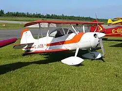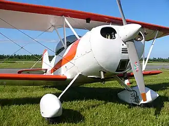 The Miniplane is a conventional single-bay biplane with staggered wings of unequal span braced with N-struts and wires.[1][7] The Miniplane design has fixed undercarriage with a steerable tailwheel[7] and although designed with an open cockpit,[1][4][7] many have been fitted with canopies. The fuselage and the tail fin are of a conventional truss design constructed of welded steel tube and covered in fabric,[1][2][7][8] and the wing spars and ribs are made from spruce and also fabric-covered.[1][2][7][8] A variant has been built with an all-metal wing construction.[9]