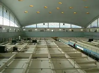 The concrete shell roof spans 225 × 125 feet (69 × 38 m), with a double curvature sheet in the form of an elliptic paraboloid, mostly only 3 inches (7.6 cm) thick but up to 6 inches (15 cm) at the edges. It is claimed to be the largest concrete shell structure ever built, and the largest clear spanning dome roof in Europe. The shallow structure only rises 30 feet (9.1 m) in the centre, and is supported by pre-stressed concrete edge beams with clerestory glazing below, so it appear to balance on its corners. It is pierced by circular rooflights. The external roof surface and gables on each side are clad in copper.