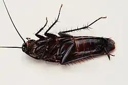 Although not closely related to the American cockroach (Periplaneta americana), the smokybrown cockroach is sometimes confused with it, but readily distinguishable from it by its uniformly light to dark brown–mahogany coloration.[2] Furthermore, unlike P. americana, which possesses a light-rimmed pattern on its thorax, the smokybrown cockroach's thorax is dark and shiny.[2]