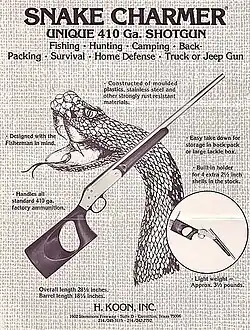 The Snake Charmer was introduced in 1978, by H.Koon, Inc., of Dallas, Texas.[1][2] It originally sold for $89.95[2] and was marketed as a general-purpose utility shotgun perfect for "Fishing - Hunting - Camping - Back Packing - Survival - Home Defense - Truck or Jeep Gun."