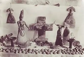 The Knossos figurines, both significantly incomplete, date to near the end of the neo-palatial period of Minoan civilization, around 1600 BCE.[1] It was Evans who called the larger of his pair of figurines a "Snake Goddess", the smaller a "Snake Priestess"; since then, it has been debated whether Evans was right, or whether both figurines depict priestesses, or both depict the same deity or distinct deities.[2]