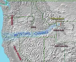 The Snake River Plain has a significant effect on the climate of Yellowstone National Park and the adjacent areas to the south and west of Yellowstone. Over time, the Yellowstone hotspot left a 70-mile (110 km) wide channel through the Rocky Mountains. This channel is in line with the gap between the Cascade Range and the Sierra Nevada. The result is a moisture channel extending from the Pacific Ocean to Yellowstone. Moisture from the Pacific Ocean streams onshore in the form of clouds and humid air. It passes through the gap between the Sierra and Cascades and into the Snake River Plain where it is channeled through most of the Rocky Mountains with no high plateaus or mountain ranges to impede its progress.[1] It finally encounters upslope conditions at the head of the Snake River Valley at Ashton, Idaho; at Island Park, Idaho; at the Teton Range east of Driggs, Idaho; and at the Yellowstone Plateau of Yellowstone National Park where the channeled moisture precipitates out as rain and snow.[2] The result is a localized climate on the eastern side of the Rockies that is akin to a climate on the west slope of the Cascades or the northern Sierra. The head of the Snake River Valley, the Tetons, and the Yellowstone Plateau receive much more precipitation than other areas of the region, and the area is known for being wet, green, having many streams, and having abundant snow in winter.